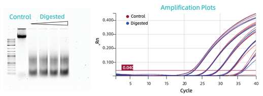 完整的和不同程度降解的CHO DNA的提取與擴增效果對比。將完整的gDNA(Control)與分別用Alu1酶處理30min、1h、1.5h和2h后的DNA(Digested)凝膠電泳圖像。對照組和酶處理30min組樣品擴增的線(xiàn)性范圍基本一致(如下圖)。