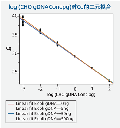 存在外源DNA的情況下,CHO引物/探針仍具有廣泛的線(xiàn)性范圍和特異性。不同濃度的E. coli DNA不會(huì )影響CHO DNA的標準曲線(xiàn)(如下圖)。