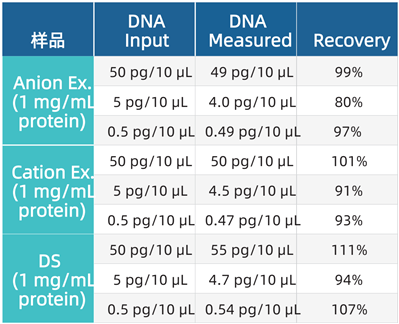 過(guò)程樣品與藥物原液(DS)檢測結果對比。對比含有1 mg/mL陰離子交換或陽(yáng)離子交換純化的蛋白樣品或藥物蛋白的CHO DNA回收率(見(jiàn)下表)。